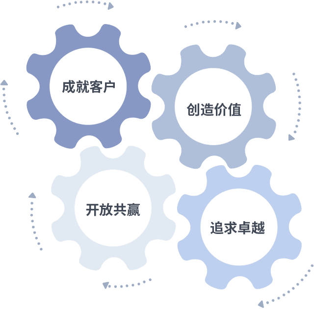 成就客户是一切决策的出发点,,,,创造价值是衡量所有工作的标准,,,追求卓越是我们做事做人的态度,,开放共赢是我们的格局也是最终的结果。。。价值观的齿轮环环相扣,,推动着组织里的每个人不断向前。。